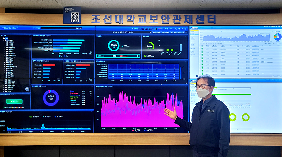 Chosun University's Security Control Center centrally manages the whole campus network through a TiController. It maintains a pleasant network environment by identifying connected terminals, types, IPs, and traffic usage at a glance and blocking the spread of harmful traffic that causes excessive traffic or security accidents.