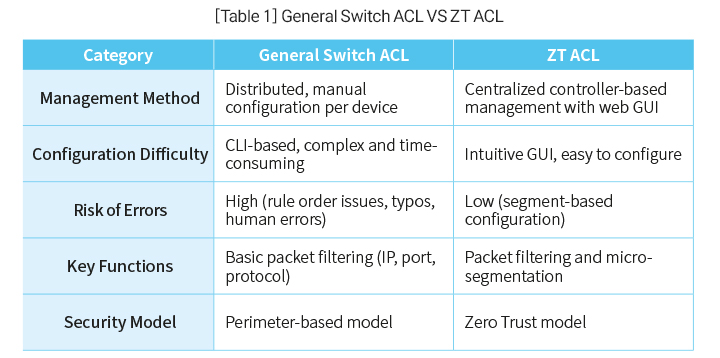 ZT ACL goes beyond simple packet filtering by enabling centralized policy management and automated policy deployment, delivering a practical implementation of the Zero Trust security model. By overcoming the limitations of manual, CLI-based ACL operations, ZT ACL delivers three core values: Ease of Management, Policy Consistency, and Automation—establishing a new paradigm in network security management.