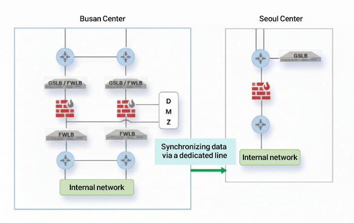 At the customer’s site, GSLB was configured so that during normal operations, users are directed to the Busan main center. If a line failure or outage occurs at the Busan center, GSLB automatically switches user traffic to the Seoul DR center, ensuring uninterrupted service.