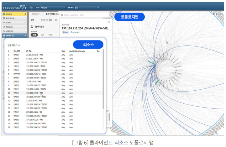 아래 화면은 티컨트롤러(TiController) 관리 시스템에서 보안스위치가 실시간으로 수집한 네트워크 연결 상태를 토폴로지 맵 형태로 시각화한 것입니다. 이 화면을 통해 관리자는 각 클라이언트가 어떤 리소스에 연결되어 있는지, 어떤 통신이 발생하고 있는지를 한눈에 파악할 수 있습니다.
