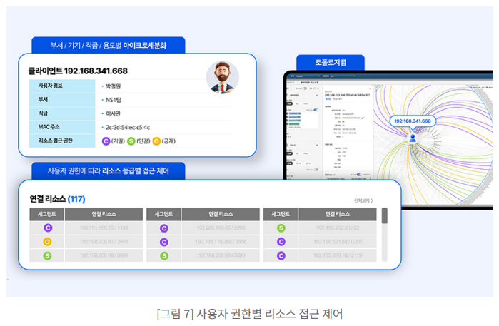 ● 내부 네트워크 특화 가시성 : 내부 네트워크의 사용자, 기기, 리소스 간의 실제 통신 경로와 접근 권한을 시각적으로 명확하게 보여줌으로써, 내부 네트워크에서의 위협 확산을 효 과적으로 방지하고 제어할 수 있습니다.