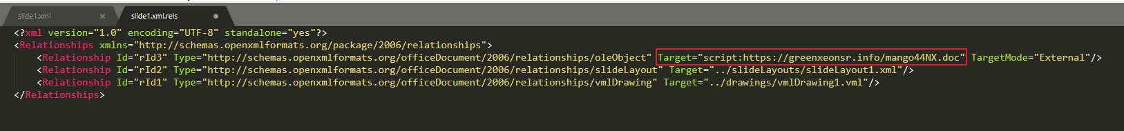 ppsx 파일 열람 시 백그라운드에서 실행되는 스크립트는 “slide1.xml.rels” 파일로 “hxxps://greenxeonsr[.]info/” 라는 C2 서버에서 mango44NX.doc 라는 파일을 다운로드 받는다.