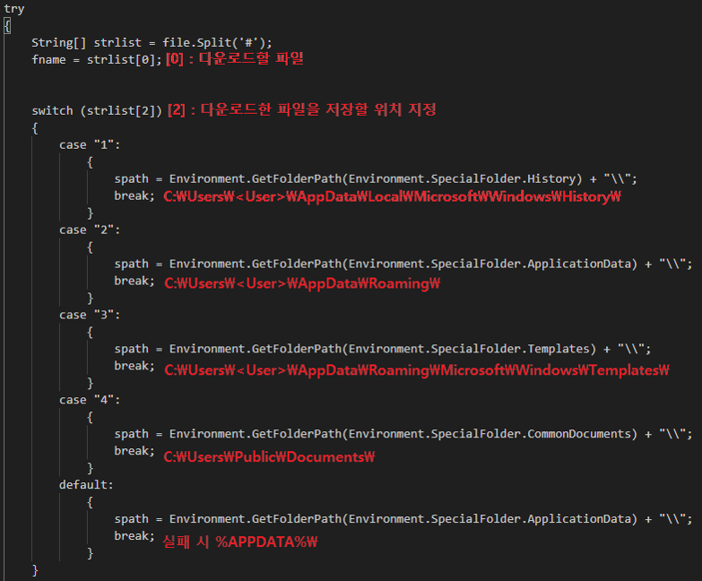명령어 데이터는 “#’ 로 구분되며 첫 부분은 다운로드할 파일의 이름, 세 번째 부분은 파일을 저장할 위치를 지정한다.