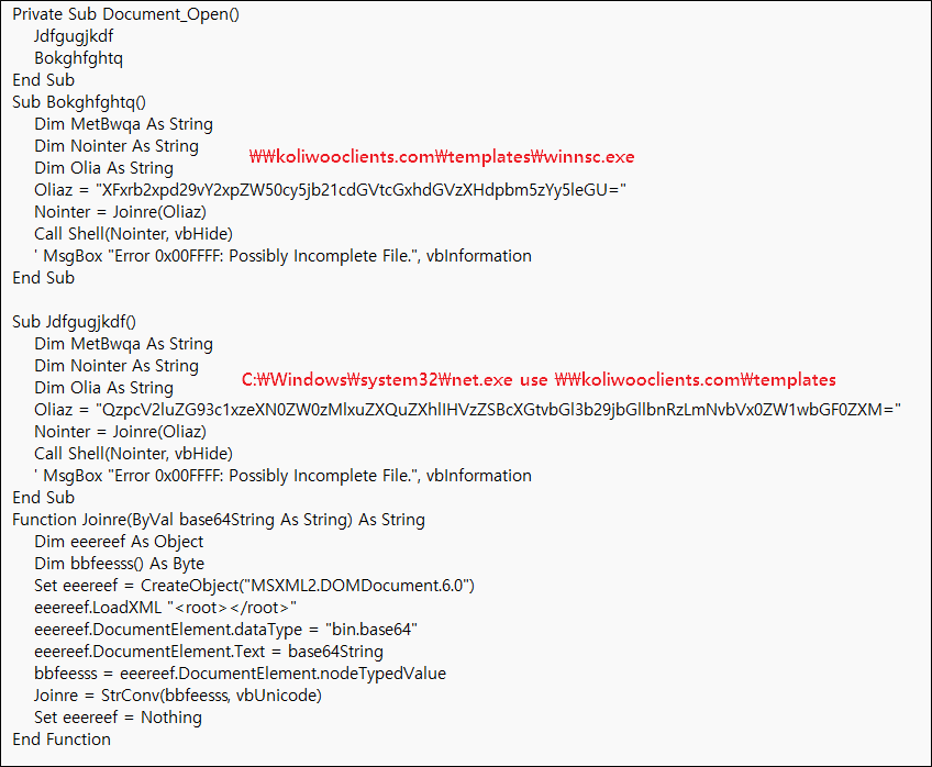 Document.docx 파일은 5byte의 미끼파일로 악성 Normal.dotm 파일의 실행을 유도하는데 사용된다. %APPDATA%\Romaing\Microsoft\Templates 경로에 들어간 악성 Normal.dotm 파일은 기본 템플릿 파일로 위장해 word가 시작할 때마다 열린다.