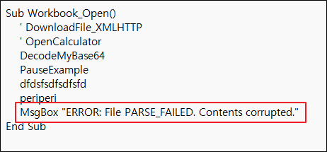 <그림 3>은 내장된 매크로 코드로 실행 시 의도적으로 에러 메시지 창을 띄우는 것을 알 수 있다.