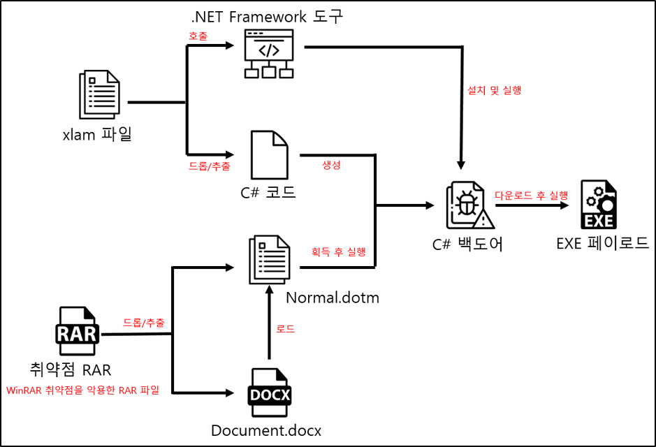 WinRAR 경로 탐색 취약점을 악용해 피해자의 템플릿 폴더에 있는 Normal.dotm 파일을 악성 파일로 교체한다. 이후 피해자가 DOCX 문서를 열면 자동으로 악성 매크로가 실행되며 원격 서버에서 백도어를 다운로드 해 실행한다.