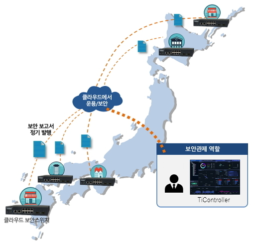 PSI는 고객 사이트에 클라우드 보안스위치를 설치하고, TiController를 클라우드 서버에 두고 직접 관리했다. 각 사이트에 설치된 스위치가 장애 및 보안 상황을 관제하고 이벤트 경보 및 분석 정보를 이메일이나 모바일 앱으로 알려주기 때문에 PSI 관리자는 고객 네트워크 상황을 실시간으로 파악할 수 있다.